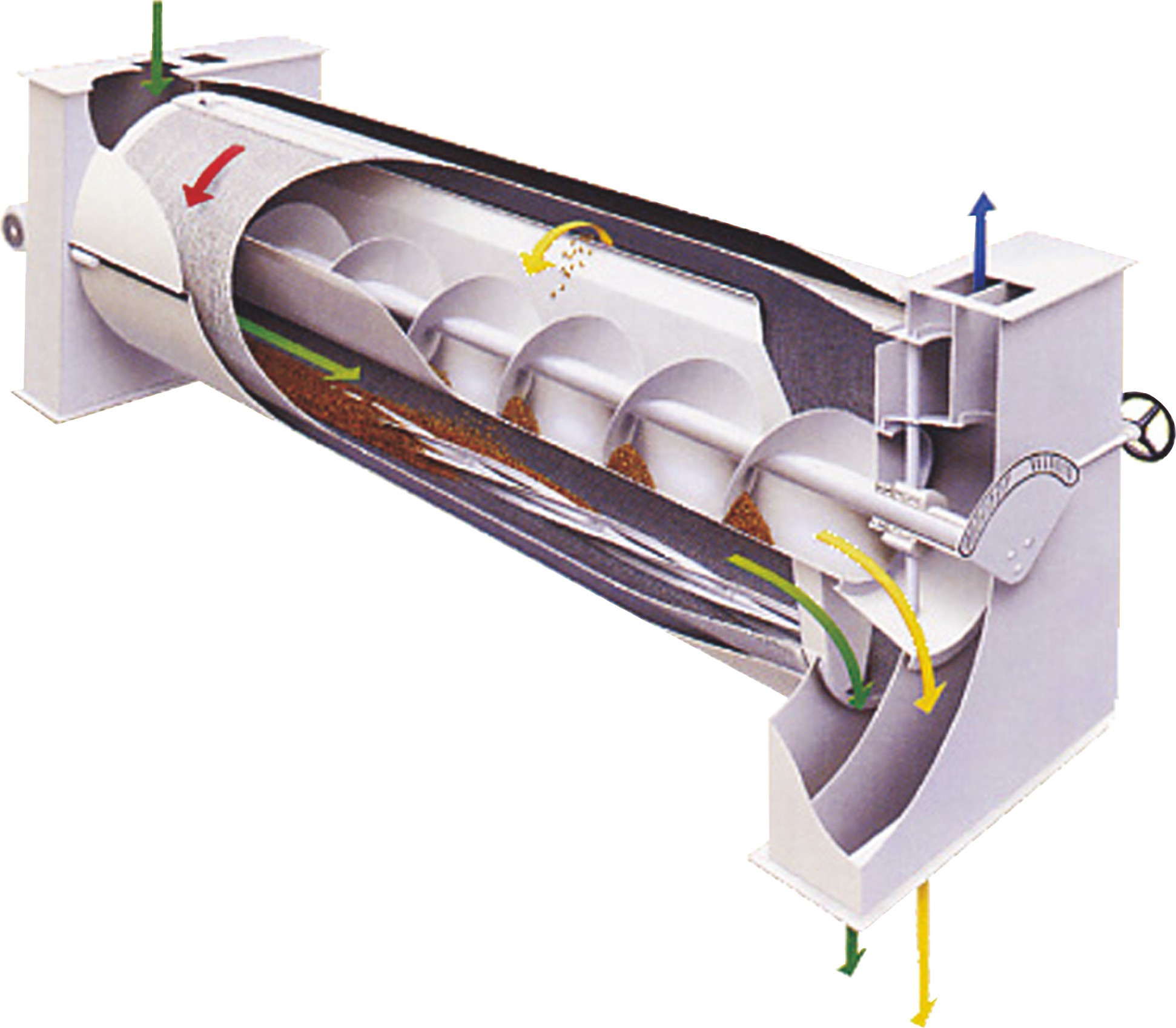 物料從主機架上部入口處進入窩眼滾筒內(nèi),旋轉(zhuǎn)的窩眼滾筒上沖有尺寸精確的氣泡式窩眼,小于窩眼內(nèi)徑的顆粒會嵌入窩眼內(nèi),隨滾筒上行一定距離后落入中心U型料槽,而后被U型料槽內(nèi)的螺旋攪龍排出設(shè)備;而較長或較大的顆粒則因無法嵌入窩眼內(nèi)徑而滯留在滾筒里,最終經(jīng)由滾筒內(nèi)的另一端出口排出。因此,窩眼筒精選機不僅可以去雜質(zhì),也可以當(dāng)成更精準(zhǔn)的分級機使用。